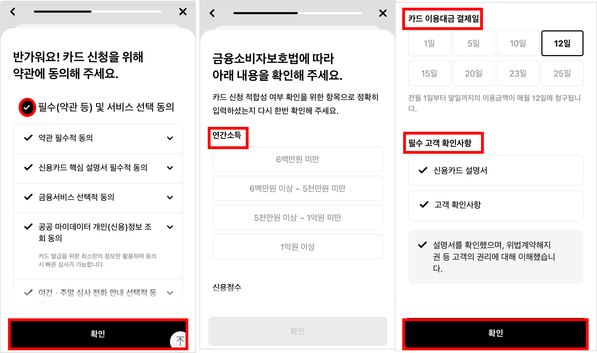 - 카드 신청을 위해 약관 동의 및 카드 신청 적합성 여부 확인을 위해 연간 소득, 신용점수 등 선택해줍니다.