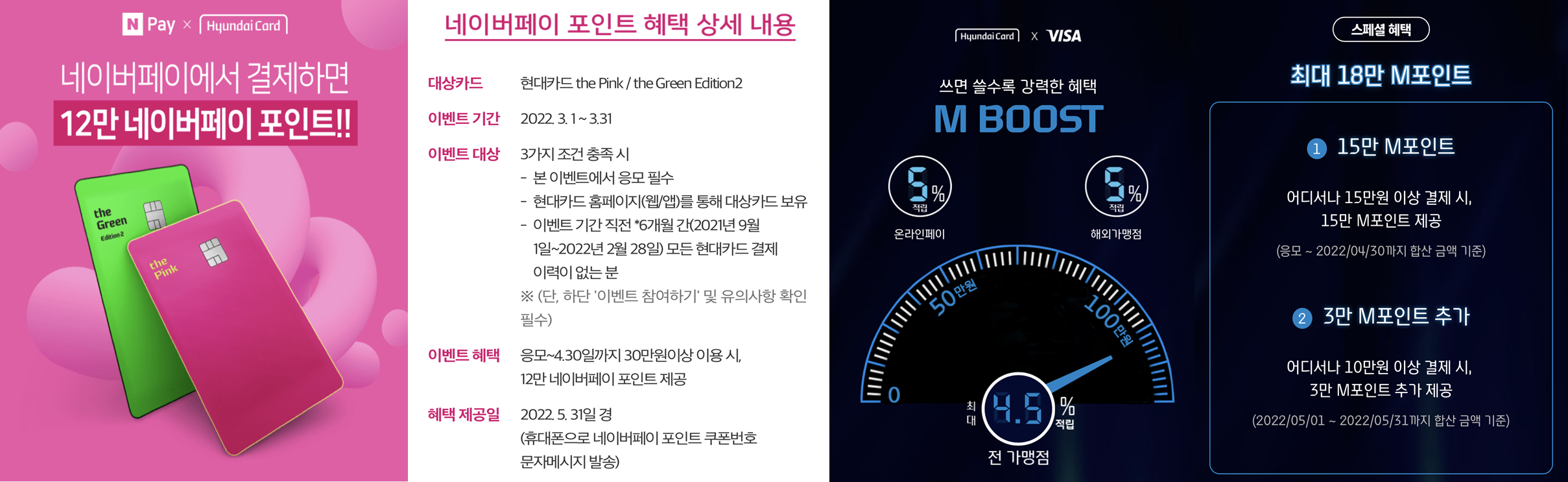 사실 소개해드리는 X BOOST 외에도 현대카드 신규이벤트는 네이버페이 제휴 이벤트, M BOOST 카드도 있답니다.