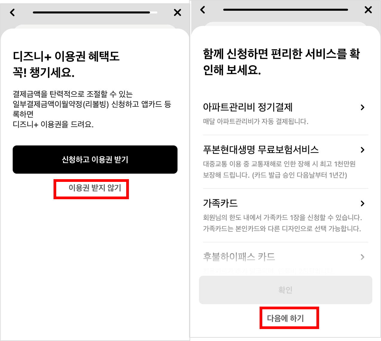 - 일부결제금액 이월 약정(리볼빙) 및 관리비 정기 결제 등의 서비스 혜택 선택해줍니다.