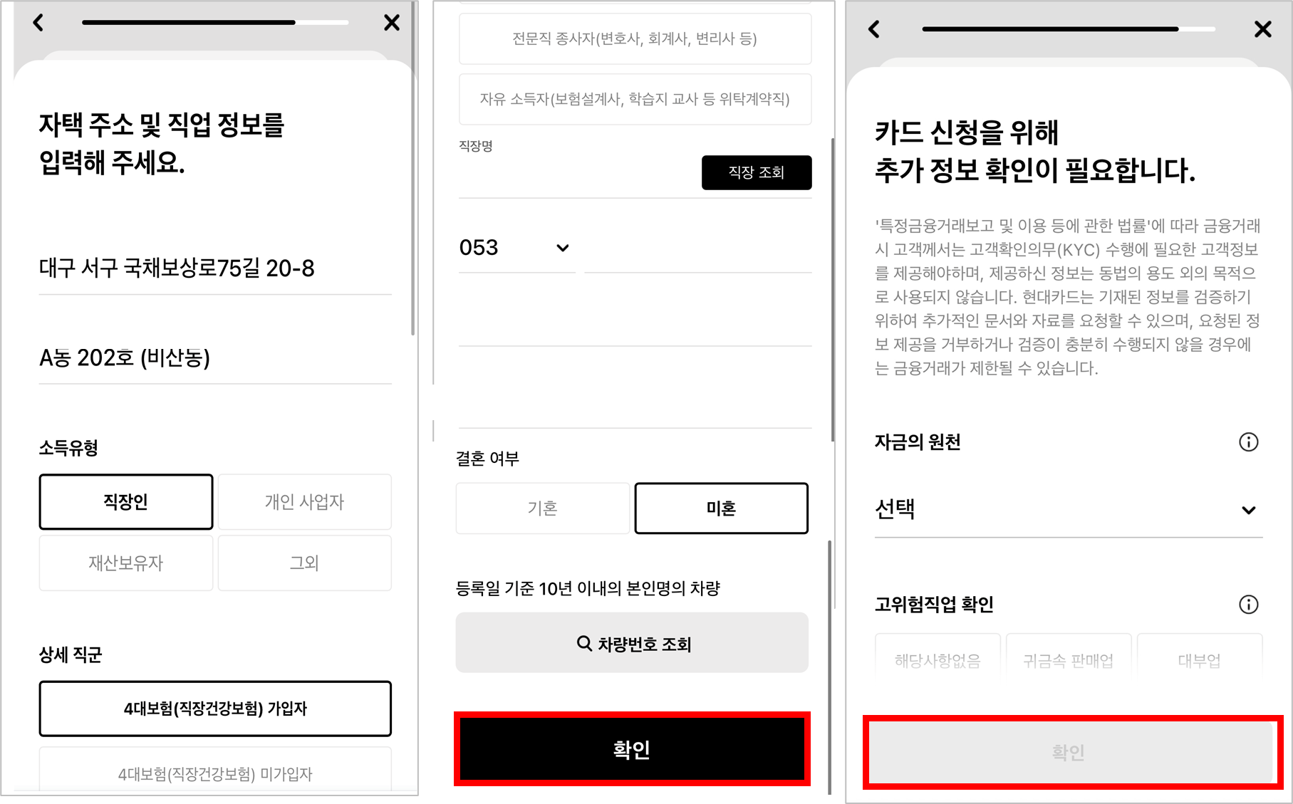 - 자택 주소, 직업정보, 자금 원청 등을 입력해줍니다.