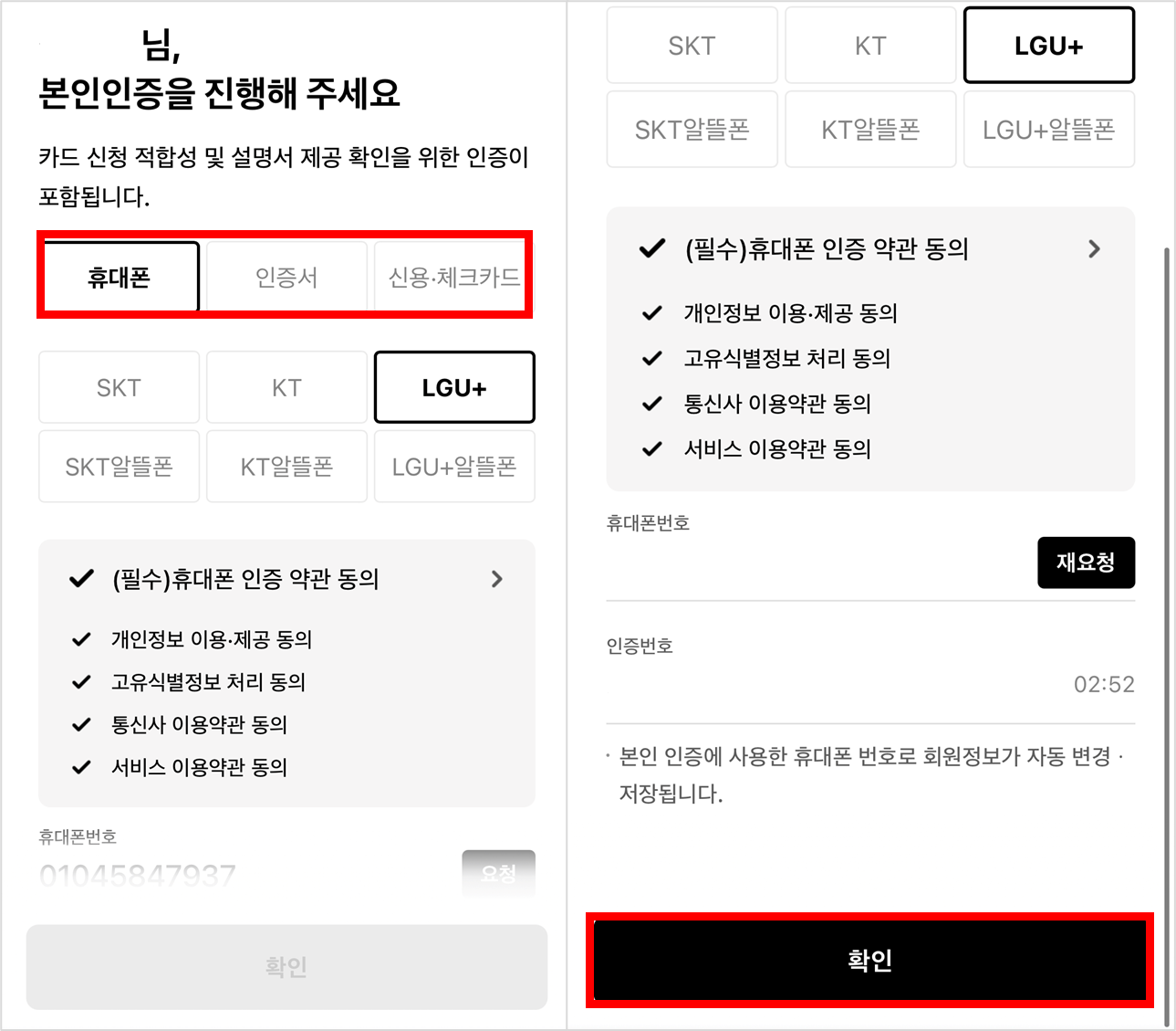 -본인인증(휴대폰, 인증서, 신용&체크카드) 방법 선택 후 본인인증 해줍니다.