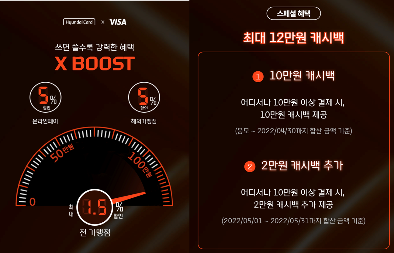 '현대카드 X BOOST' 는 2022년 3월 현재 총 12만원 캐시백 혜택이 있어요.
