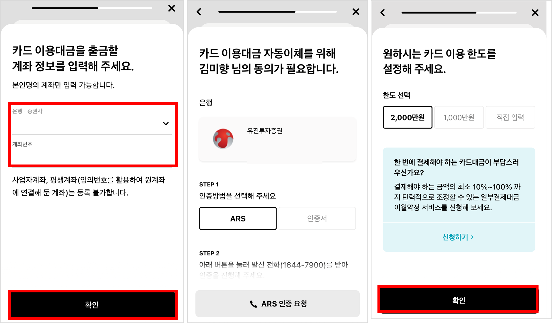 - 카드 이용대금 출금할 계좌 입력 후 인증해줍니다.